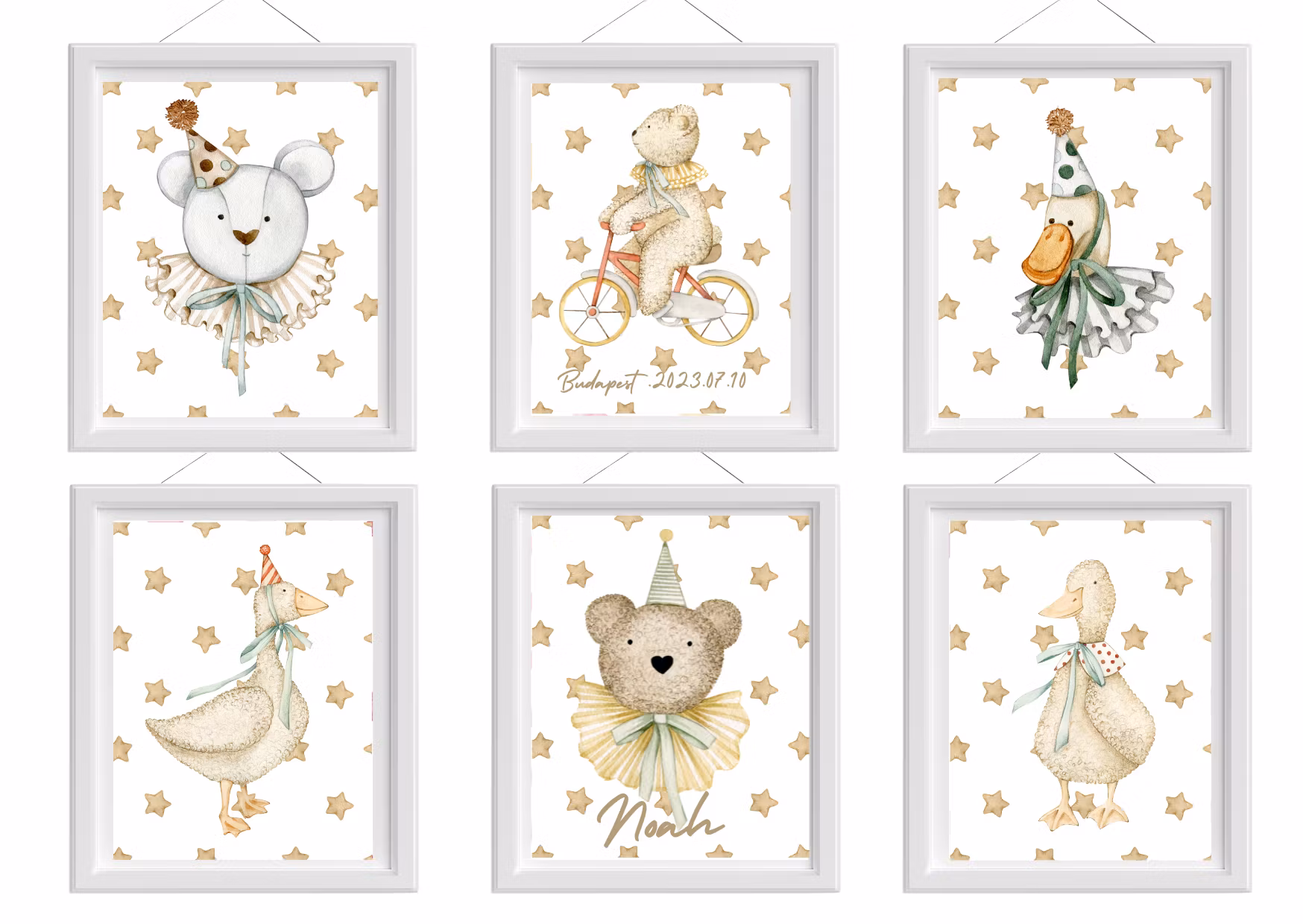 Barntavlor med charmiga djur i beige toner. Set om 6 eller enskilda. A4 & A3. Kan personaliseras med namn, plats & datum. Perfekt för barnrum.