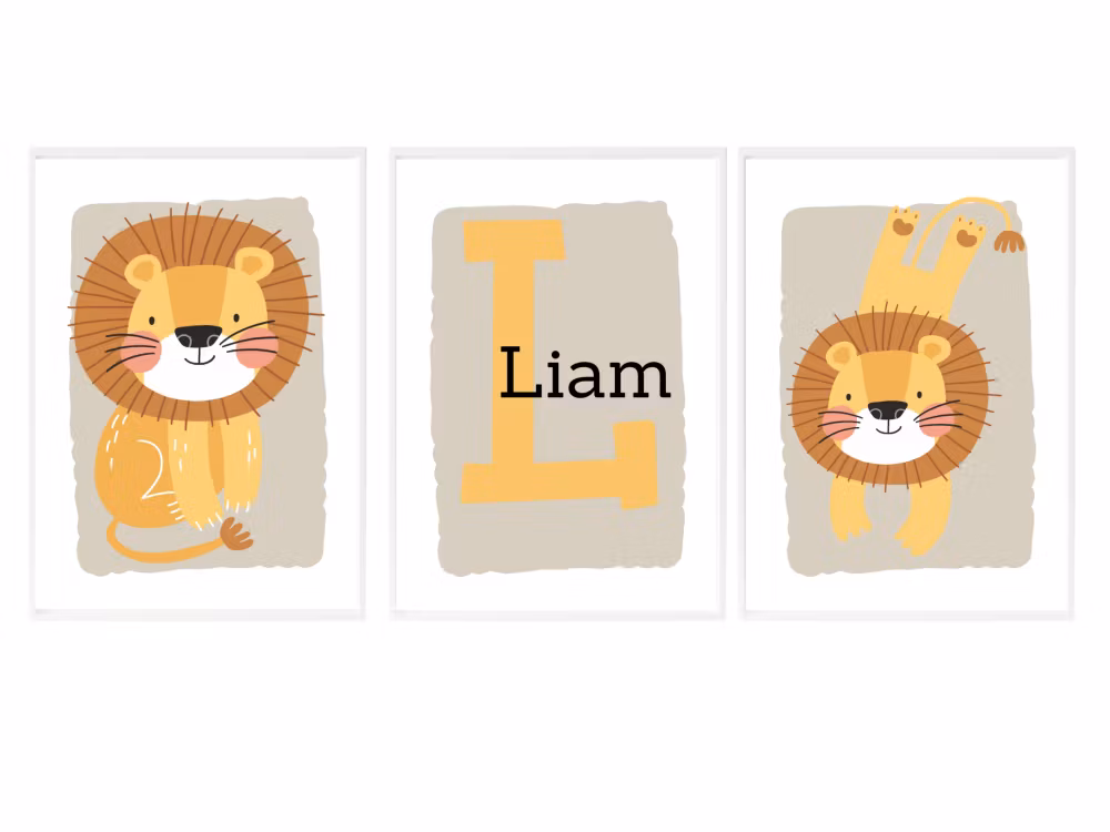 Skapa en varm, lekfull atmosfär i barnrummet med dessa personliga barntavlor med lejonmotiv. Setet består av tre olika illustrationer med en söt lejonunge i mjuka, jordnära färger – perfekt för barnrum, lekhörna eller som en unik doppresent.