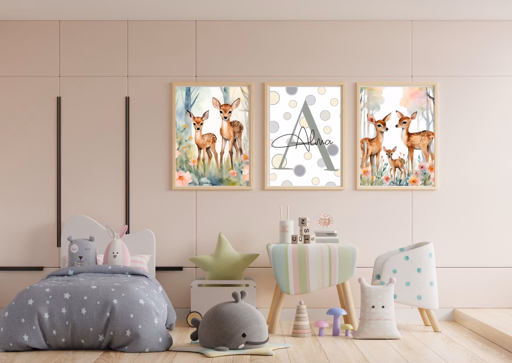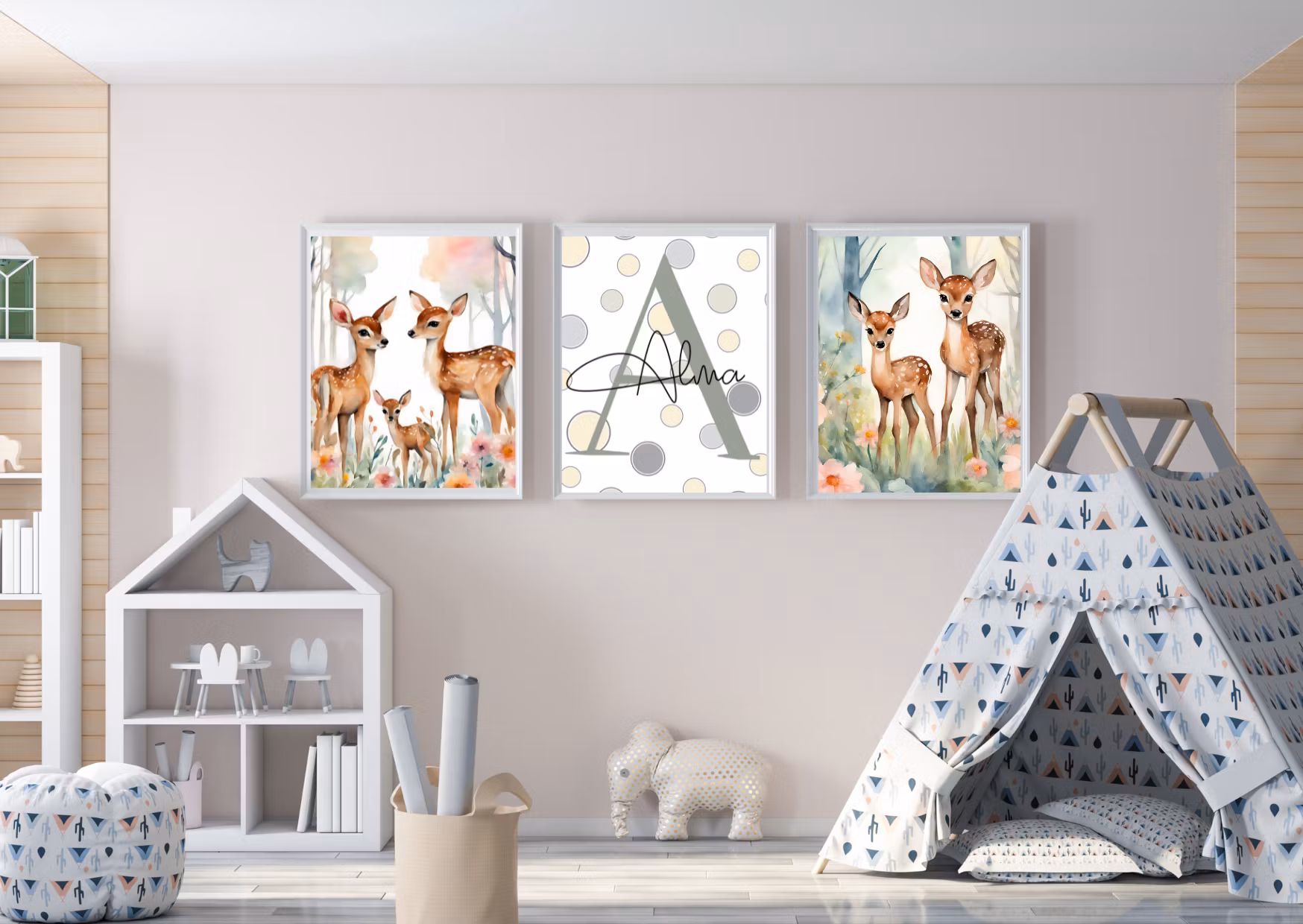 Som en del av dekorationssetet för barnrum erbjuder vi tre underbara bilder som barn kommer att älska.