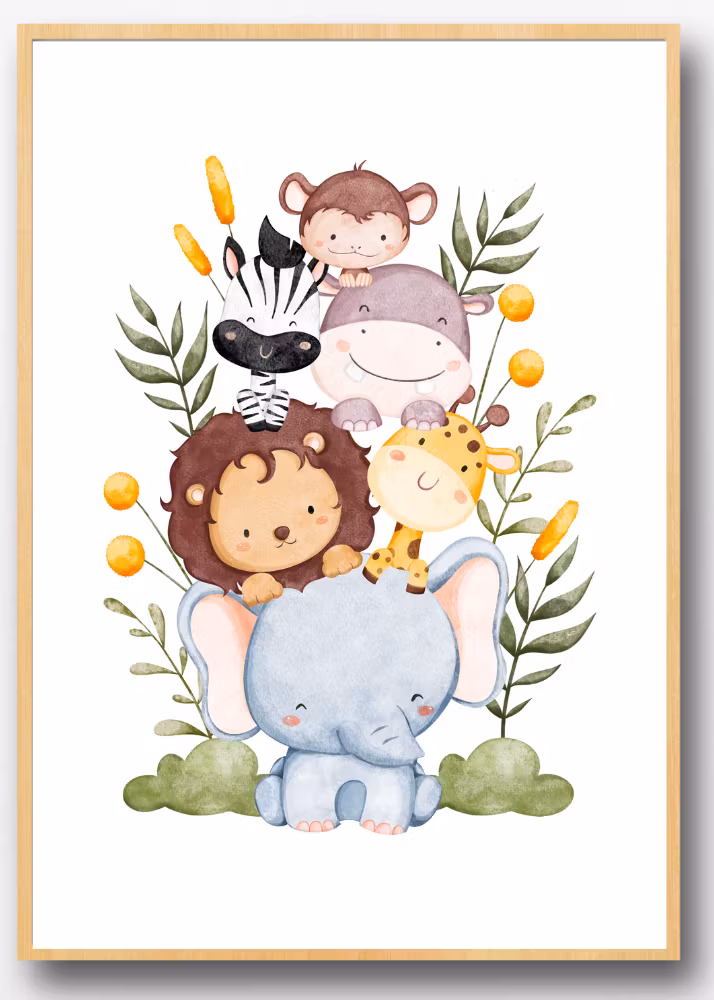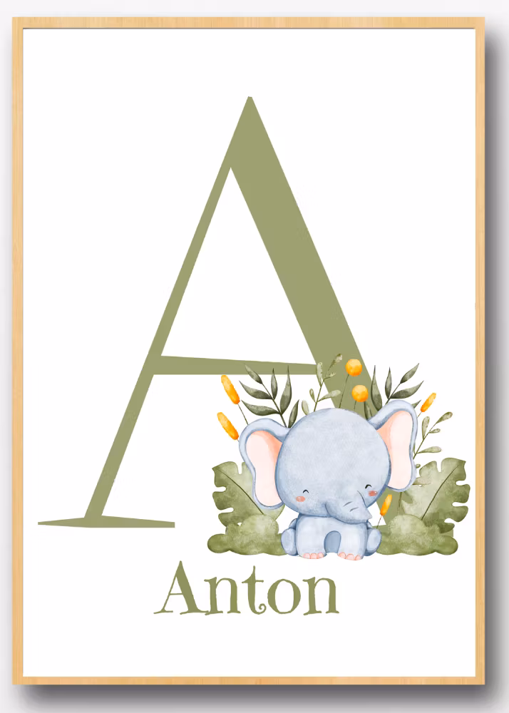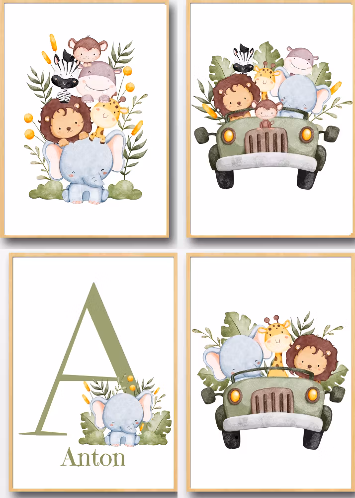 Gör barnrummet till en djurisk safari! 🐘🦒 Personliga barntavlor med söt faktor. A4/A3, högkvalitativt matt papper. Köp 3, få 1 gratis!